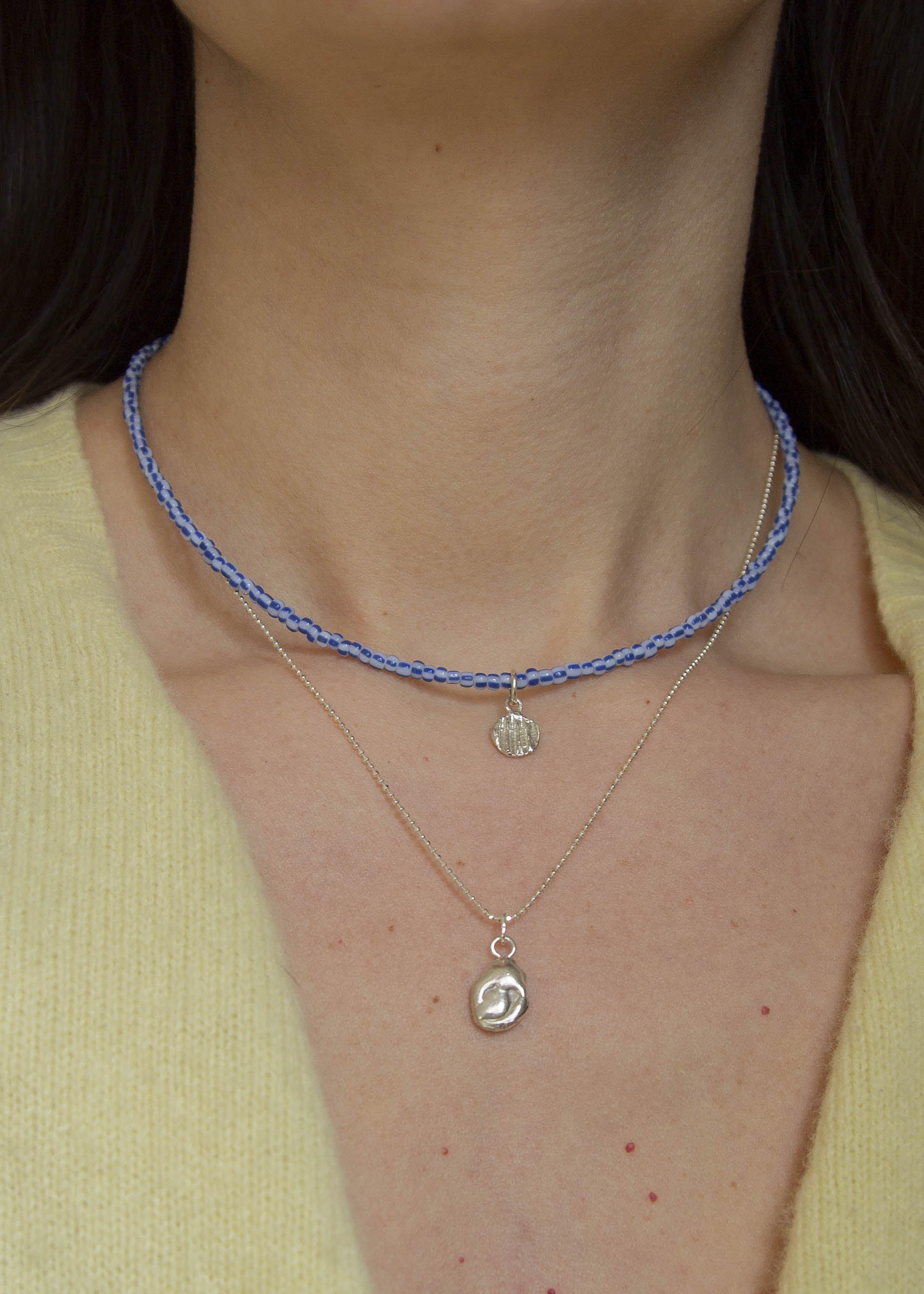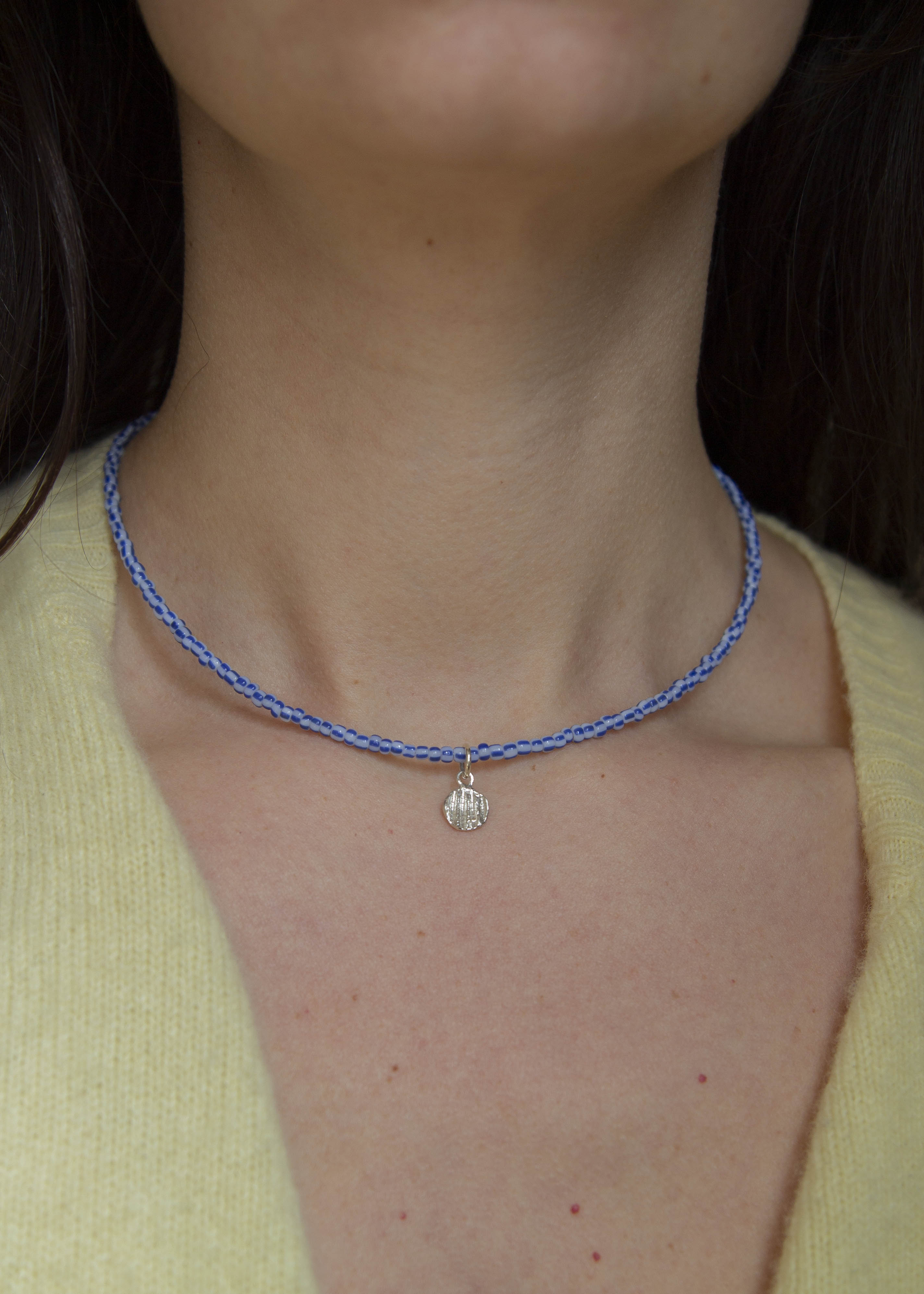 Striped blue-and-white glass beads meet a sterling silver shell charm, cast from a real shell. A piece that feels like summer captured in a piece.