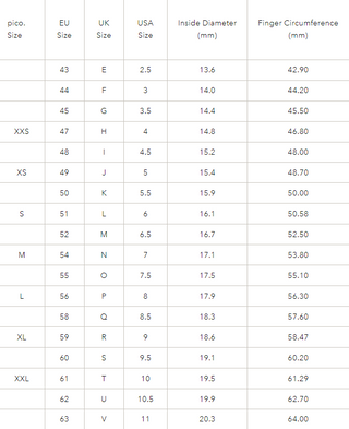 Refer to the Finger Circumference column in the Ring Size Chart below to figure out your size.